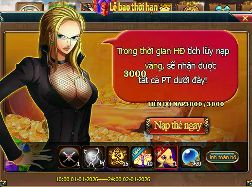 Quy tắc HĐ: Trong thời gian HĐ, mức nạp thẻ tích lũy của người chơi đạt 3000 vàng, là có thể lĩnh toàn bộ PT trong giao diện HĐ;