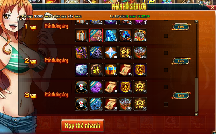- Trong thời gian HĐ, vàng người chơi nạp trong thời gian HĐ đều sẽ được tích lũy, đạt đến mức vàng yêu cầu, là có thể nhấn vào nút nhận thưởng để nhận thưởng;