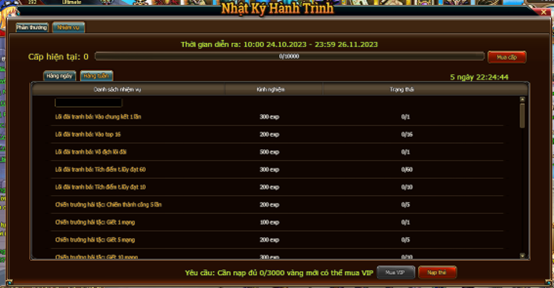 - Phần thưởng có 2 loại Thường và Vip. Người chơi không mua Vip vẫn có thể nhận được phần thưởng Thường. Người chơi mua Vip có thể nhận cả 2 loại phần thưởng. Người chơi mua Vip Cần nạp đủ 3000 vàng mới có thể mua Vip. Giá mua Vip là 5000 Vàng.