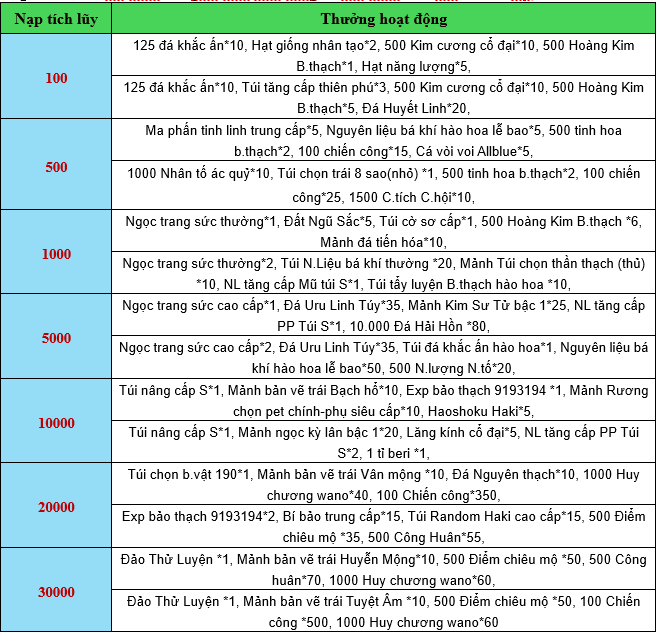 - Tất cả vật phẩm nhận được của hoạt động, sẽ gửi trực tiếp vào nhân vật;