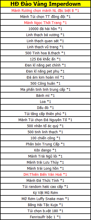 - Trong thời gian hoạt động người chơi đánh quái sẽ có xác xuất nhận được các vật phẩm sau: