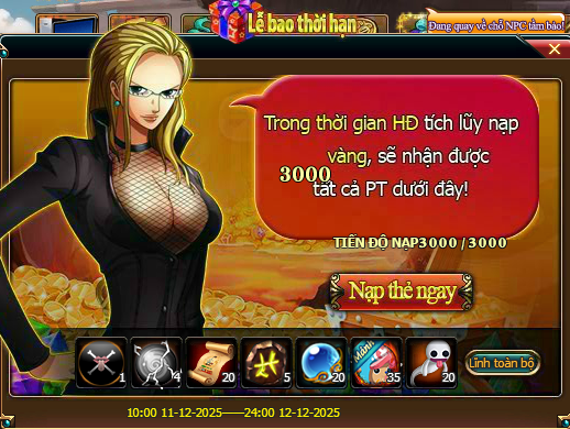 Quy tắc HĐ: Trong thời gian HĐ, mức nạp thẻ tích lũy của người chơi đạt 3000 vàng, là có thể lĩnh toàn bộ PT trong giao diện HĐ;