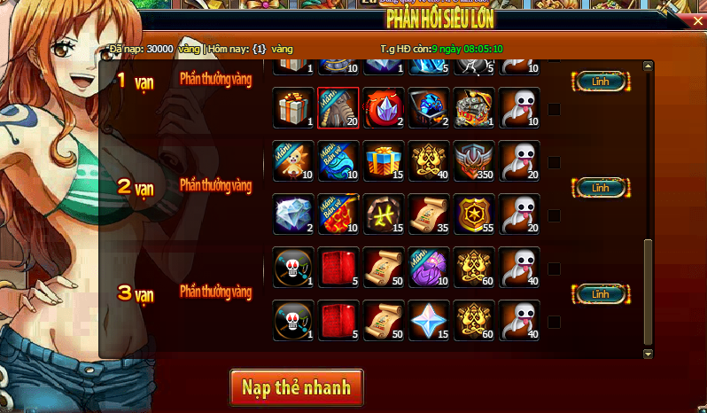 - Trong thời gian HĐ, vàng người chơi nạp trong thời gian HĐ đều sẽ được tích lũy, đạt đến mức vàng yêu cầu, là có thể nhấn vào nút nhận thưởng để nhận thưởng