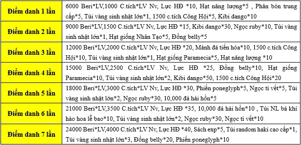 - Giá trị phần thưởng sẽ tăng theo số ngày đăng nhập mỗi ngày của người chơi, hoạt động kết thúc thì không thể lĩnh bù nữa.