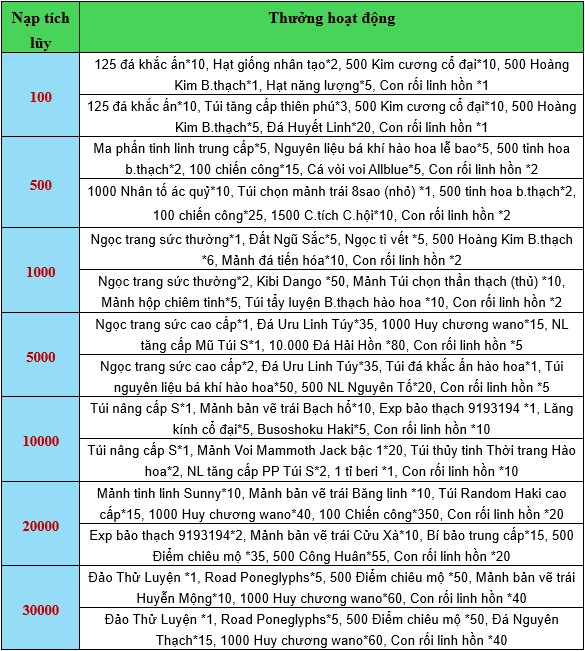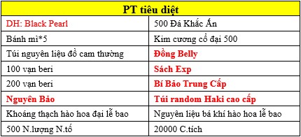 Nội dung PT: Băng Hải Tặc Bellamy*1, Busoshoku Haki*4, 500 Điểm chiêu mộ*20, Bí bảo trung cấp*5, Ngọc tì vết *20, Mảnh Lệnh bài thú cưỡi Chopper*35, Con rối linh hồn *20