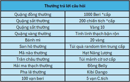 - Tích lũy 50 lần trả lời đúng, có thể nhận được phần thưởng “Băng hải tặc Arlong”, Túi Random Haki cao cấp *1
