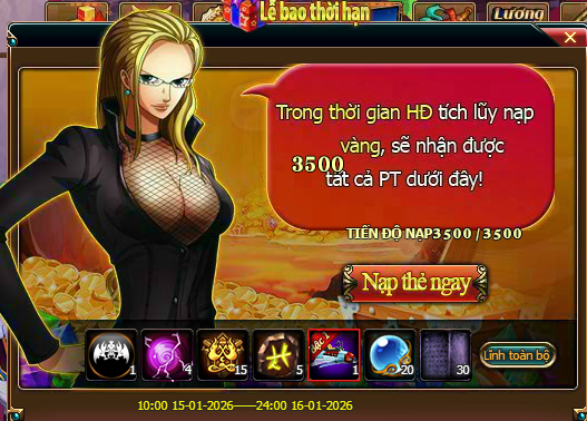 Quy tắc HĐ: Trong thời gian HĐ, mức nạp thẻ tích lũy của người chơi đạt 3500 vàng, là có thể lĩnh toàn bộ PT trong giao diện HĐ;