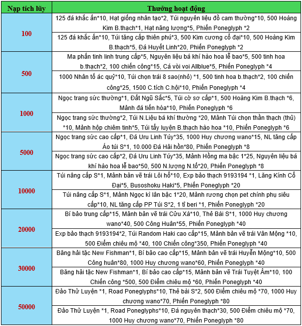 - Tất cả vật phẩm nhận được của hoạt động, sẽ gửi trực tiếp vào nhân vật;
