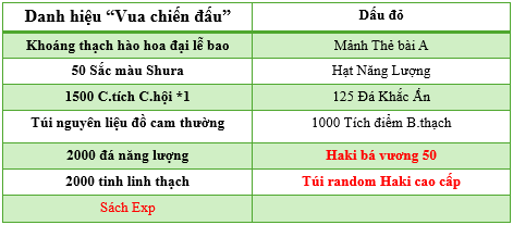 Nội dung PT: Băng Hải Tặc Moria*1, Haoshoku Haki*4, 1000 Huân Chương Wano*15, Bí bảo trung cấp*5, Cá chuồn bậc 1*1, Ngọc tì vết*20, Phiến Poneglyphs*30