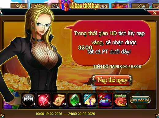 Quy tắc HĐ: Trong thời gian HĐ, mức nạp thẻ tích lũy của người chơi đạt 3500 vàng, là có thể lĩnh toàn bộ PT trong giao diện HĐ;