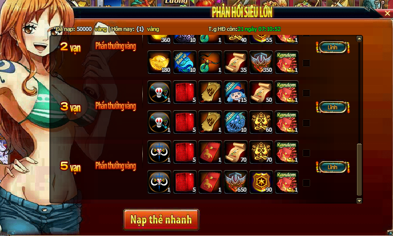 Mỗi ngày có thể nhận được:Vàng 200 , NL KN tối thượng *2, Đồng Belly *2, Dấu Đỏ *10, NL bá khí hào hoa lễ bao *3