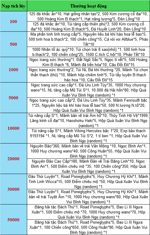 - Tất cả vật phẩm nhận được của hoạt động, sẽ gửi trực tiếp vào nhân vật;