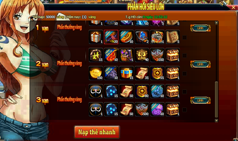 - Trong thời gian HĐ, vàng người chơi nạp trong thời gian HĐ đều sẽ được tích lũy, đạt đến mức vàng yêu cầu, là có thể nhấn vào nút nhận thưởng để nhận thưởng;