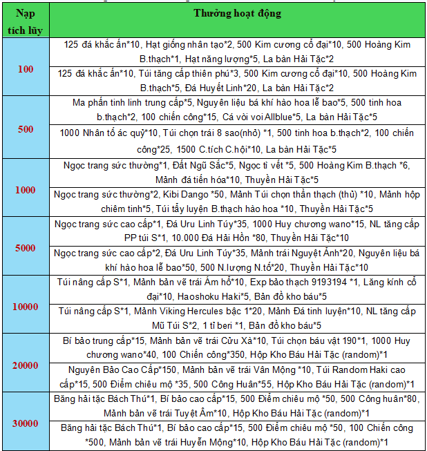 - Tất cả vật phẩm nhận được của hoạt động, sẽ gửi trực tiếp vào nhân vật;