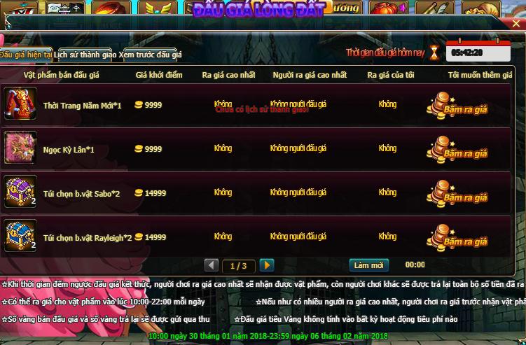 - Trong thời gian hoạt động có thể ra giá cho vật phẩm khác nhau, sau khi kết toán người ra giá cao nhất sẽ nhận được vật phẩm đấu giá, vàng ra giá của người chơi khác sẽ được trả lại sau kết toán trong ngày;