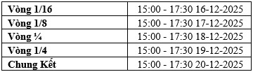 Giai đoạn vòng bảng: 15:00 16-12-2025 đến 17:30 20-12-2025