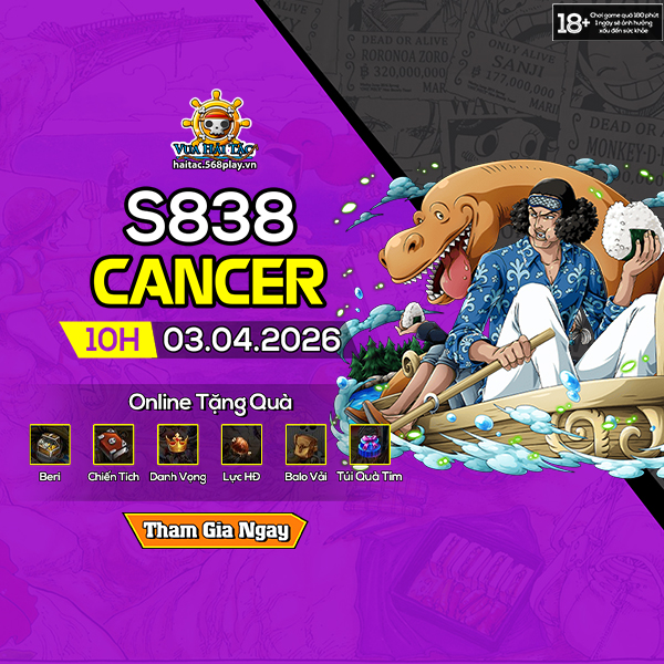Máy chủ mới S838.Cancer sẽ chính thức khai mở vào 10h ngày 03/04/2026. Hãy cùng tham gia vào hành trình bất tận, không điểm dừng và chính các thuyền trưởng sẽ là người lãnh đạo cả nhóm vươn tới mục tiêu duy nhất “Tìm kiếm One Piece và trở thành Vua Hải Tặc”