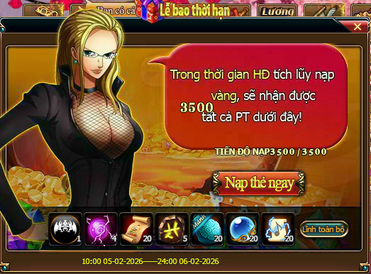 Quy tắc HĐ: Trong thời gian HĐ, mức nạp thẻ tích lũy của người chơi đạt 3500 vàng, là có thể lĩnh toàn bộ PT trong giao diện HĐ;