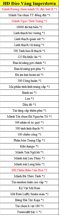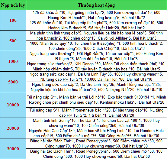 Nội dung PT: Băng Hải Tặc Moria*1, Haoshoku Haki*4, 500 Điểm chiêu mộ*20, Bí bảo trung cấp*5, Mảnh trái Thánh Quang*20, Ngọc tì vết*20, Bài Hát Uta*20