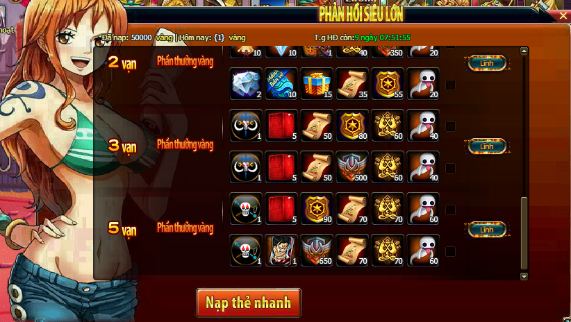 1. Trong thời gian HĐ, vàng người chơi nạp trong thời gian HĐ đều sẽ được tích lũy, đạt đến mức vàng yêu cầu, là có thể nhấn vào nút nhận thưởng để nhận thưởng