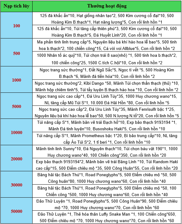 Nội dung PT: Băng Hải Tặc Bellamy*1, Busoshoku Haki*4, 500 Điểm chiêu mộ*20, Mảnh trái Tam nguyên*10, Bon Chari bậc 1*1, Ngọc tì vết*20, Con rối linh hồn*20