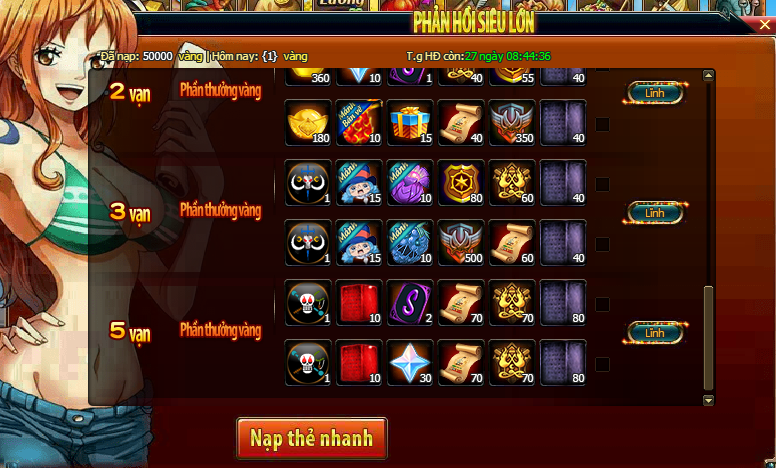 - Trong thời gian HĐ, vàng người chơi nạp trong thời gian HĐ đều sẽ được tích lũy, đạt đến mức vàng yêu cầu, là có thể nhấn vào nút nhận thưởng để nhận thưởng