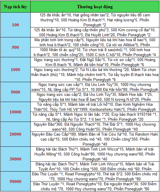 - Tất cả vật phẩm nhận được của hoạt động, sẽ gửi trực tiếp vào nhân vật;