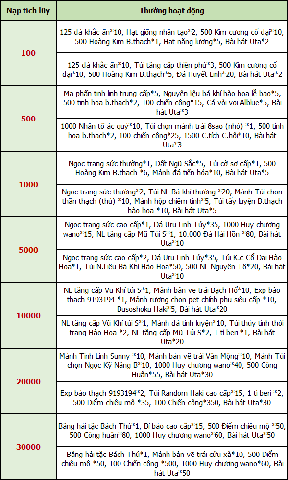 - Tất cả vật phẩm nhận được của hoạt động, sẽ gửi trực tiếp vào nhân vật;
