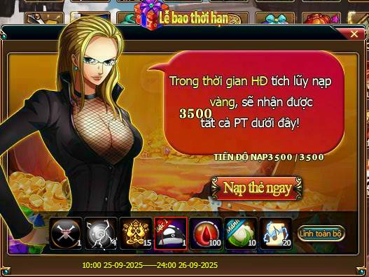 Quy tắc HĐ: Trong thời gian HĐ, mức nạp thẻ tích lũy của người chơi đạt 3500 vàng, là có thể lĩnh toàn bộ PT trong giao diện HĐ;