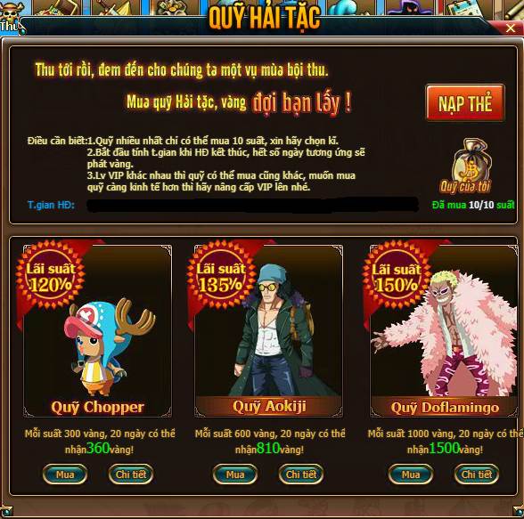 - Quỹ Doflamingo: VIP5 có thể mua, tiêu 1000 vàng, HĐ kết thúc được nhận 500 vàng, sau đó cứ 5 ngày có thể lĩnh 250 vàng ( lĩnh 4 lần), tổng cộng lĩnh 1500 vàng.