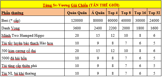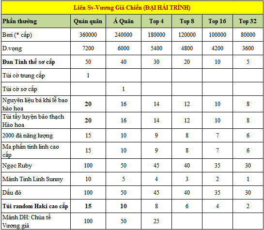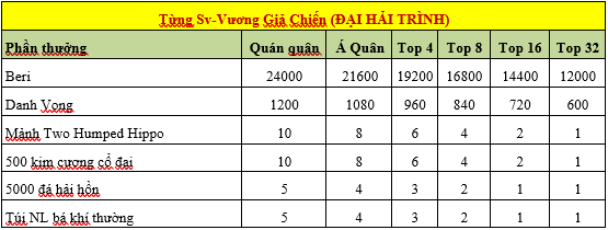 - Vương giả chiến từng server 1000Beri*Lv, 100 Danh vọng