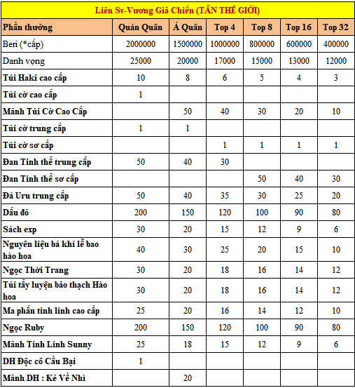 - Tất cả người chơi ở server của Quán Quân Tân Thế Giới nhận được: 50000*LV Beri, 1000Danh vọng