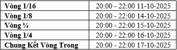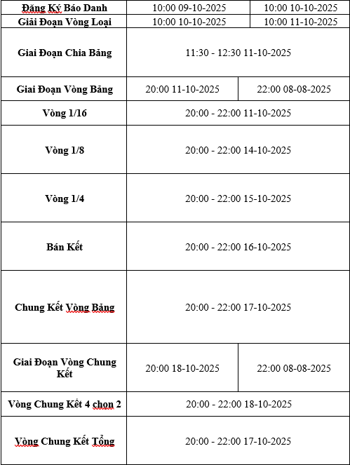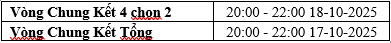 Giai đoạn vòng loại: 10:00 ngày 10-10-2025 đến 10:00 ngày 11-10-2025